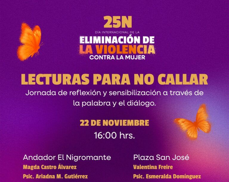 Morelia, Michoacán; 19 de noviembre de 2025.- La Secretaría de Cultura de Morelia (SeCultura) invita a la ciudadanía a participar en las “Lecturas para no callar”, una jornada simultánea de reflexión y sensibilización a través de la palabra y el diálogo en el marco del 25 de noviembre (25N), Día Internacional de la Eliminación de la Violencia contra la Mujer.