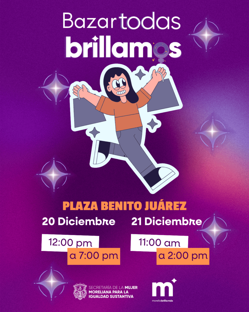 Morelia, Michoacán; 05 de diciembre de 2025.– Con el objetivo de fortalecer la autonomía económica de las mujeres y fomentar el consumo local, la Secretaría de la Mujer Moreliana para la Igualdad Sustantiva (Semmujeris), parte del gobierno encabezado por el presidente Alfonso Martínez Alcázar, invita al Bazar “Todas Brillamos”.